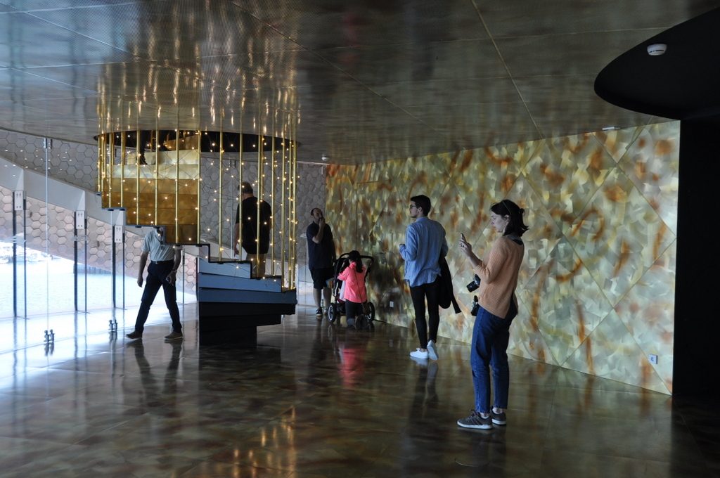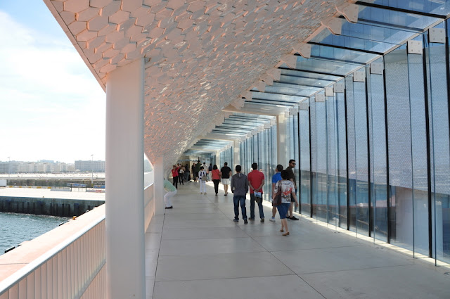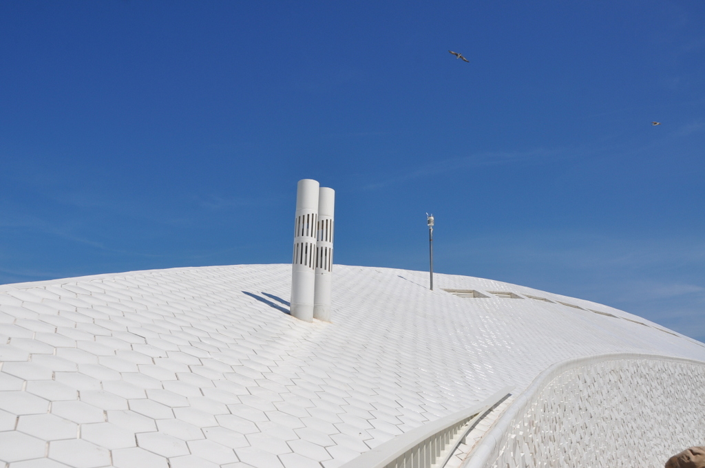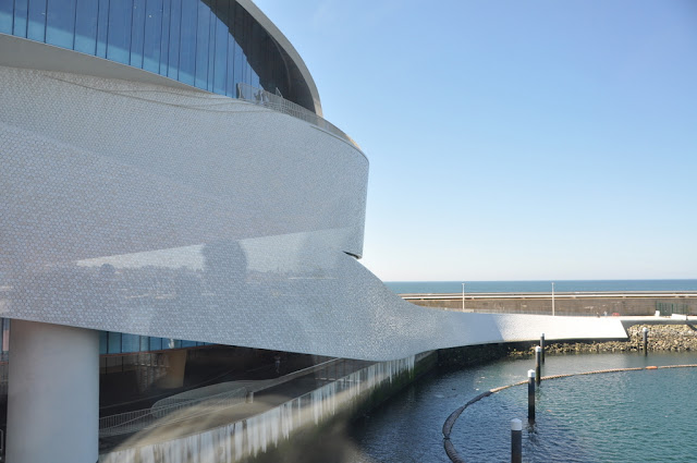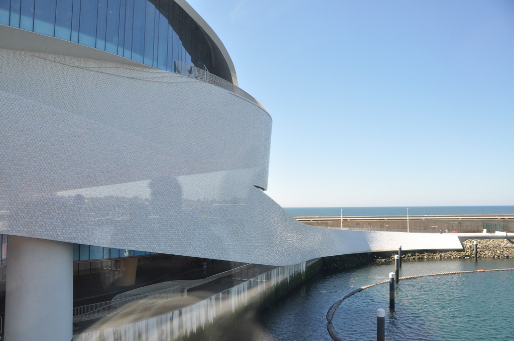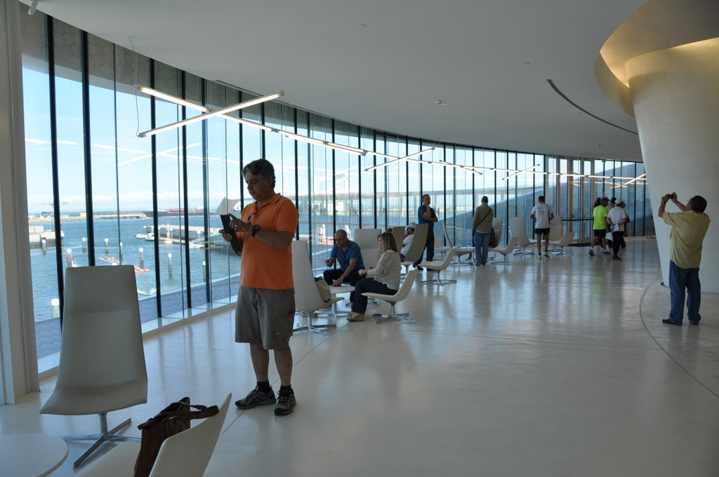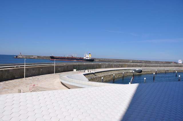 Em dia de Open House visitamos o Terminal de Cruzeiros do Porto de Leixões. A sala de entrada de quem nos procura em cruzeiro é uma obra premiada do Arq. Luis Pedro Silva que muito nos encantou e deve orgulhar. Uma obra em forma de um qualquer molusco marinho, coberta a azulejo a sugerir escama, dispõe-se à volta de uma rampa em espiral que a atravessa e delimita os espaços: o interior com as suas funcionalidades de check in / check out, os gabinetes do futuro Parque da Ciência e Tecnologia do Mar, Restaurante, Auditório e no exterior, o mar, a cidade que se debruça para ele e os seus encantos.